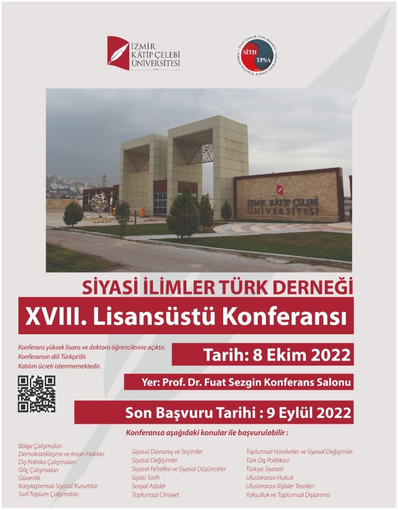 Siyasi İlimler Türk Derneği’nin XVIII. Lisansüstü Konferansı, 8 Ekim 2022’de İzmir Kâtip Çelebi Üniversitesi, Prof. Dr. Fuat Sezgin Konferans Salonu’nda gerçekleşecektir. Konferans yüksek lisans ve doktora öğrencilerine açıktır. Son Başvuru Tarihi: 9 Eylül 2022.